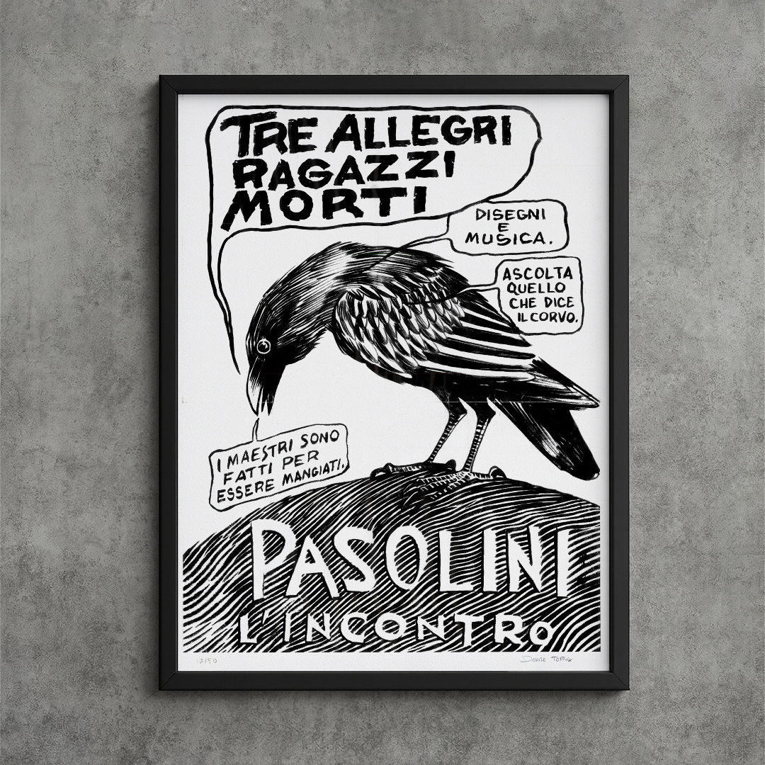 Disponibili ora nel negozio online de La Tempesta le serigrafie del manifesto realizzato nel 2015 da Davide Toffolo per lo spettacolo dei Tre Allegri Ragazzi Morti dedicato a Pier Paolo Pasolini.